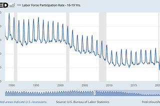 Teenage labor force participation has fallen significantly since the turn of the century.